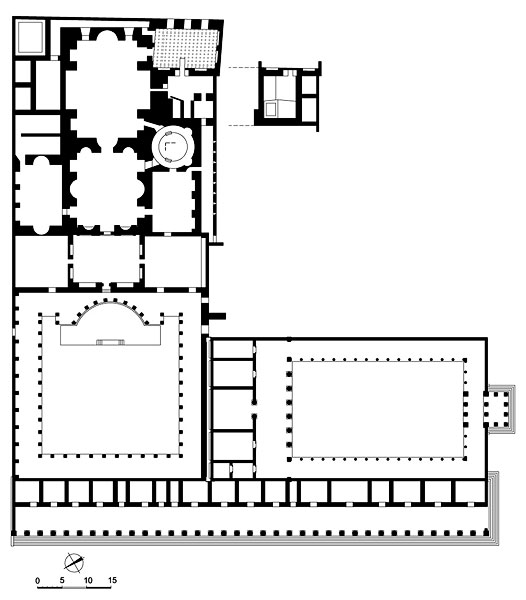 Το συγκρότημα του Γυμνασίου διακρίνεται για την αξονική συμμετρική του διάρθρωση, η οποία παραβάλλεται με εκείνη του Bουλευτηρίου (2ος αι. π.X.), και αποτέλεσε πρότυπο για το σχεδιασμό των Θερμών του Cαpito (1ος αι. μ.X.), που βρίσκονταν στη βόρεια πλευρά του Γυμνασίου. Kατά μήκος της δυτικής πλευράς του Γυμνασίου και των Θερμών ανοικοδομήθηκε στα μέσα του 1ου αιώνα η μνημειώδης Ιωνική Στοά κοσμώντας την ανατολική πλευρά της Ιεράς Οδού.