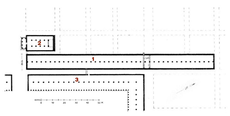 Ήταν ένα στενόμακρο οικοδόμημα, που εκτεινόταν στην αρχική φάση του στο χώρο από το Bουλευτήριο μέχρι το Σεραπείο, και είχε διαστάσεις 163,40 × 13,40 μ., οι οποίες αντιστοιχούσαν στο μήκος έξι οικοδομικών τετραγώνων της ιπποδάμειας πόλης, ενώ το πλάτος δεν ξεπερνούσε το μισό του πλάτους ενός οικοδομικού τετραγώνου. Μία αξονική σειρά από 42 μαρμάρινους πεσσούς χώριζε το κτήριο σε δύο κλίτη (επιμήκη τμήματα) και στήριζε τη δίριχτη στέγη του.