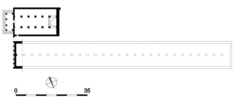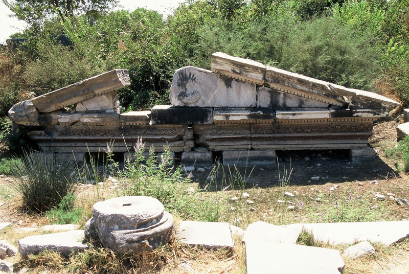 Η κάτοψη του ναού (διαστάσεων 22,5 × 12,5 μ.) θυμίζει τον τύπο της βασιλικής, αφού εσωτερικά χωριζόταν σε τρία κλίτη μέσω δύο ιωνικών κιονοστοιχιών. Στο βόρειο πέρας του κεντρικού κλίτους, απέναντι από την είσοδο, υπήρχε βάθρο, χτισμένο σε τριβαθμιδωτή κρηπίδα, που πιθανόν αποτελούσε τη βάση του λατρευτικού αγάλματος. Την είσοδο του ναού κόσμησε στα χρόνια του αυτοκράτορα Αυρηλιανού (270-275) ένα μνημειώδες μαρμάρινο πρόπυλο, το οποίο ήταν ανάθημα του Mιλησίου Julius Aurelius Menekles.