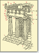 Το τμήμα του οικοδομήματος πάνω από τους τοίχους και τους κίονες, ο θριγκός, περιελάμβανε το επιστύλιο, το διάζωμα και το γείσο. Αρχικά, ο θριγκός είτε ήταν εξ' ολοκλήρου από ξύλο, είτε ξύλινος με πήλινη επένδυση. Αργότερα ένα μέρος του κατασκευαζόταν από λίθο ή μάρμαρο, αλλά η κεράμωση του παρέμεινε πήλινη εκτός από εξαιρετικές περιπτώσεις, όπως στον Παρθενώνα όπου ακόμα και αυτή ήταν μαρμάρινη. Η οροφή, ξύλινη ή λιθόγλυπτη, είχε συνήθως τη μορφή διακοσμημένων επάλληλων τετράγωνων εσοχών, που ονομάζονταν φατνώματα. Οι δύο επικλινείς πλευρές της στέγης δημιουργούσαν στις στενές πλευρές της έναν τριγωνικό χώρο, το αέτωμα, η πίσω πλευρά του οποίου κλεινόταν από κάθετο τοίχο, το τύμπανο. Στα πρώιμα χρόνια το αέτωμα διακοσμούσαν ανάγλυφες παραστάσεις και αργότερα κυρίως ολόγλυφες αγαλματικές συνθέσεις. Φυτικά μοτίβα ή αγάλματα, τα λεγόμενα ακρωτήρια, τοποθετούνταν επίσης στις έξι γωνίες της δίριχτης στέγης. | ![]() |
