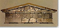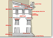 Το δωρικό διάζωμα αποτελείται από στενά μέλη με κάθετες αυλακώσεις -τα τρίγλυφα- και από πλατύτερες επιφάνειες που φέρουν συχνά γλυπτές ή γραπτές παραστάσεις, τις μετόπες. Τρίγλυφα και μετόπες εναλλάσσονται κανονικά και υπάρχουν τρίγλυφα πάνω από τον κάθε κίονα, πάνω από το μέσο κάθε μετακιόνιου διαστήματος και στις γωνίες. Η τοποθέτησή τους αυτή σχετίζεται με το λεγόμενο πρόβλημα της γωνιακής μετόπης (η οποία εμφανιζόταν μεγαλύτερη) και οδήγησε σε ποικίλες λύσεις, όπως στη βαθμιαία αλλαγή του πλάτους των μετακιονίων. Πάνω από το διάζωμα υπάρχει ένα γείσο, με μία ελαφρά κλίση προς τα έξω για προστασία από τα όμβρια ύδατα, το οποίο αποτελείται από απλό κυμάτιο και στεφάνη. Στο κάτω μέρος του γείσου και ακριβώς πάνω από κάθε τρίγλυφο και κάθε μετόπη υπάρχει μία ορθογώνια πλάκα, ο πρόμοχθος, διακοσμημένη με σειρές σταγόνων. Επιπλέον, ο χώρος του αετώματος προστατεύεται από το λοξό γείσο, το καλούμενο καταιέτιο. |