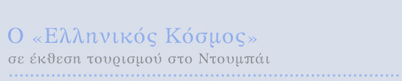 Οι δραστηριότητες του «Ελληνικού Κόσμου» ήταν, μέσω προβολής, κεντρικό έκθεμα του περιπτέρου του ΕΟΤ. Επιπλέον, οι εικονικές περιηγήσεις στην αρχαία Ολυμπία και στην Αγορά της Αθήνας προβλήθηκαν για δύο συνεχόμενες ημέρες στο πλαίσιο της πολιτιστικής ζώνης που οργάνωσε ο ΕΟΤ, με τη συμμετοχή πλήθους εκπροσώπων τουριστικών φορέων από την Ασία και τη Μέση Ανατολή. Το περίπτερο επισκέφθηκε, μεταξύ άλλων, και ο Υπουργός Πολιτισμού κ. Παύλος Γερουλάνος, ο οποίος παρουσίασε στην επίσημη κυβερνητική αντιπροσωπεία του Ντουμπάι τις δραστηριότητες του ΕΟΤ, εστιάζοντας σε τρία βασικά θέματα: το νέο Μουσείο της Ακρόπολης, τη διεξαγωγή το 2011 των Special Olympics στην Ελλάδα και το Κέντρο Πολιτισμού «Ελληνικός Κόσμος».
