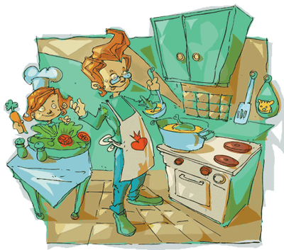 Το μεσημέρι τρώει ο καθένας σπίτι του, ό,τι υπάρχει στο τραπέζι, και μετά φτιάχνουν αστείες ιστορίες με φαγητά για να περάσουν το απόγευμά τους.