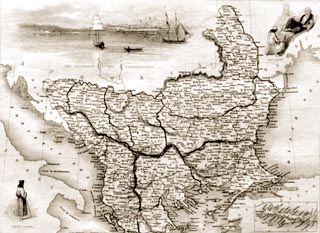 ![]() Χάρτης του ευρωπαϊκού τμήματος της Οθωμανικής Αυτοκρατορίας με χαρακτικά εποχής, 1851. Επιχρωματισμένη χαλκογραφία, 24, 5x 33 εκ. Σχέδιο, χάραξη J. Rapkin. "Tyrkey in Europe", εκδ. J. Trallis, 1851. Αθήνα, Ναυτικό Mουσείο, αρ. χαρτ. Χ 59. © Ναυτικό Mουσείο, Αθήνα. |