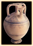 | In the 8th century BC, the production of the workshop of Knossos is notable. The frequency of pictorial representations decreases and the most important vase shapes are: the pithos with straight-sided walls, the pithos with an oval body and three loops at the base forming a tripod, and the so-called 'Cypriot flask' (lekythos). This is a kind of oinochoe with spherical body and high neck, a particularly popular shape in Cyprus. |