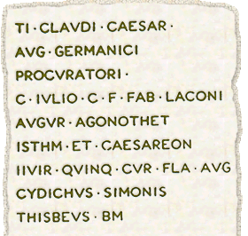 Inscribed base of porous stone, found embedded in the north-western shops of the Agora of ancient Corinth. The inscription is in honour of Gaius Julius Lacon (from the famous family of the Euryclidae at Sparta), who belonged to the equestrian order. Corinth, Archaeological Museum 929. West, A.B., Latin Inscriptions: Corinth (8,2), Cambridge/Massachusetts 1931, © Hellenic Ministry of Culture |