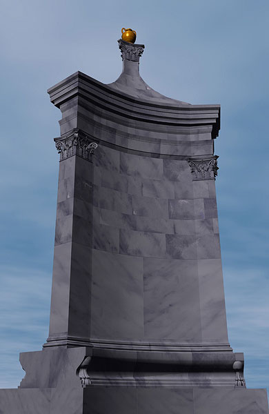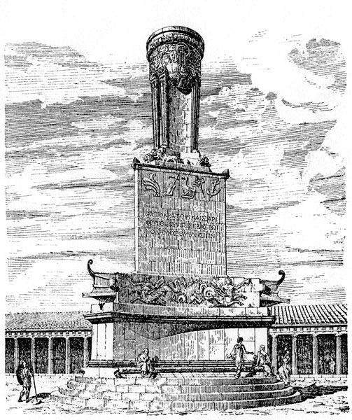 The structure of the lower part followed the form of a typical votive exedra. A socle clad with concave orthostats and crowned with mouldings, was placed on a four-stepped crepidoma of approximately 10 metres-diameter. A 0.37 m. wide marble bench ran along the socle. Above the crowning cornice lay a second, similar triangular base, which curved sides were ornamented by a low relief depicting scenes of Tritons and dolphins, ending in sculpted ship prows.