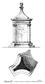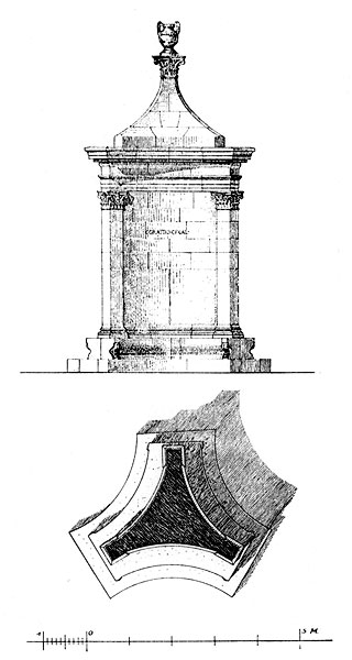 The tall core of the monument was also triangular and had pronouncedly concave sides. Its three points were shaped as antae with Corinthian capitals. On one of the sides of the triangular platform, this dedicatory inscription is preserved: C. GRATTIO C. F. GAL(ERIA). This refers to a person who lived in the period of the Flavius dynasty (69-96 AD). The edifice had a roof in the form of a pyramid of curved faces with cut edges, which concluded in a triangular Corinthian capital. On the top of the roof there was a marble amphora.