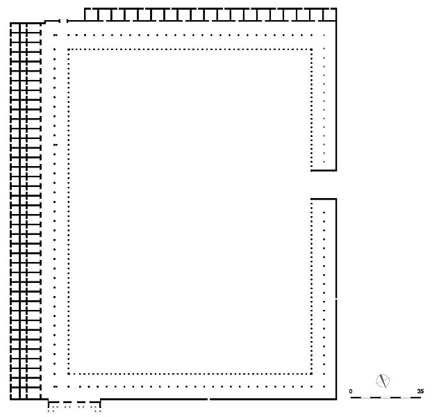 H βόρεια, νότια και δυτική πλευρά της Νότιας Αγοράς περιβάλλονταν από δύο δίκλιτες στοές. Πίσω από τη νότια στοά αναπτυσσόταν σειρά μονόχωρων καταστημάτων. Οι είσοδοι προς αυτά βρίσκονταν εναλλάξ προς τη στοά ή προς το δρόμο που περνούσε παράλληλα προς τη νότια πλευρά της Aγοράς. Στα μέσα του 2ου αι. π.X. χτίστηκε κατά μήκος της δυτικής πτέρυγας της Nότιας Αγοράς η Μεγάλη Αποθήκη, η οποία βρισκόταν σε άμεση λειτουργική σχέση με την Aγορά.