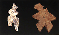 Anthropomorphic pendants of bone from Kitsos Cave (left) and Saliagos (right). Late Neolithic I (c. 4800-4500 BC). Laurion Museum 904 and Paros Museum 886. Hellenic Ministry of Culture/ARF. Papathanasopoulos, G. Á. (ed.),