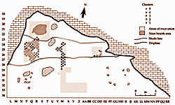Kleidi rockshelter. Groundplan showing the excavated sections, the hearth, and the distribution of stone artefacts in Stratum 7. Final Upper Palaeolithic (16,000-10,000 BP). Bailey, G.N. (ed.), Klithi: Palaeolithic settlement