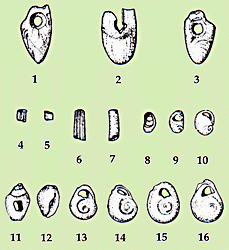 Kleidi rockshelter. Pierced deer canines and shells.
