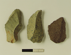Gytheion, "Lakonis". Levallois artefacts: Laminar flakes on "krokeatis lithos" (left) and centripetal flake on volcanic stone (right). Middle Palaeolithic.