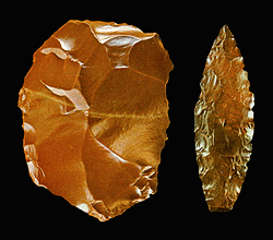 Peneios river. Flake (left) και bifacial leaf point (right) Middle Palaeolithic. Volos Museum. Hellenic Ministry of Culture/ARF. Christopoulos, G. (ed.), Istoria tou Ellinikou Ethnous,