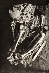 Respect towards human life and its fate after death is already manifest from the Palaeolithic Period and has been documented in Greece with isolated burials in caves, as well as with group burials, known from the Mesolithic Period. During the Neolithic Period the dead were buried inside their houses -beneath the floor- or very close to them, at the limits of the settlements they had lived in. Burials were as a rule isolated, while cemeteries have rarely been encountered; the latter date from the Early (Soufli Magoula), Late (Soufli Magoula, Platia Magoula Zarkou) and Final Neolithic (Kephala-Kea, Tharrounia-Euboea, Yiali-Dodecanese). |