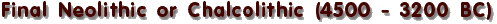 The Final Neolithic is the period (4500-3200 BC) when the transition from the Neolithic farming and stock-rearing economy, to the economy of the Early Bronze Age was being prepared while production activities improved and grew with the dissemination of the use of metals. The first working of metals (gold, silver, copper) for jewellery making and tools goes back to the Final Neolithic, also called for this reason Chalcolithic. In Thessaly it is known by the name Rachmani, while in the Cyclades and southern Greece it is referred to as Attika-Kephala culture. |