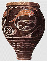 Middle Minoan pottery distinguished itself not only for aesthetically but also for the type of ceramics. The population increase during the Middle Bronze Age led to a considerable increase in ceramic production and to new usages. Cooking pots and tableware were still produced, but storage vessels and jars appropriate for carrying liquids were also made. During the Middle Minoan period (2000-1550 BC) there clay larnakes and pithoi became more common in burials and a greater variety of ceramics for ritual use appears. |