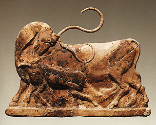 Faience plaque with wild goat feeding the baby goat from Knossos,