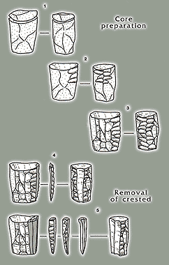The obsidian core preparation and blade detachment.