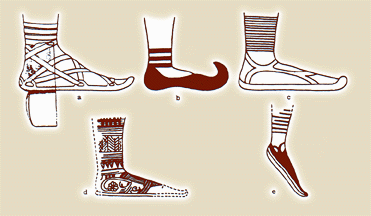 Minoan shoe types (a, c-e) and Hittite shoes (b).