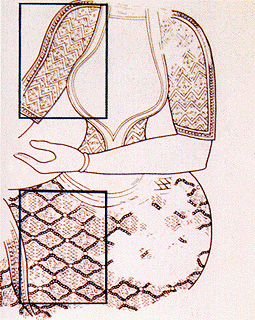 fresco with female figure from Pseira and detail of weaving patterns of the