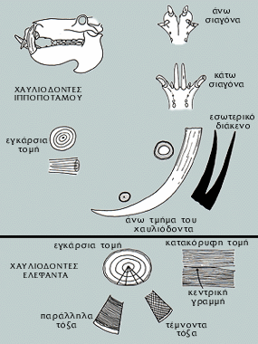 Tμήματα δοντιού ιπποπόταμου και ελέφαντα προς κατεργασία.