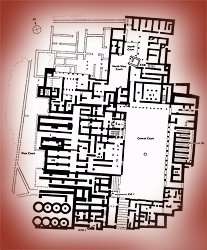 | Στη βόρεια πτέρυγα υπήρχαν επίσης δημόσιοι χώροι σημαντικοί για τη λειτουργία του ανακτόρου, όπως μία μεγάλη υπόστυλη αίθουσα με κίονες και ένα ιερό. Γύρω από τη βόρεια αυλή υπήρχαν αποθήκες, εργαστήρια και ένα ελαιοτριβείο. Την ανατολική πλευρά καταλάμβαναν αποθήκες με χαμηλά πεζούλια για την τοποθέτηση πιθαριών και αγωγούς αποχέτευσης. Στη νοτιοδυτική άκρη του ανακτόρου υπήρχαν δύο σειρές από κουλούρες που χρησίμευαν μάλλον ως σιταποθήκες. Στη νότια πτέρυγα βρίσκονταν κυρίως εργαστηριακοί χώροι. | |