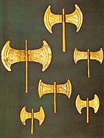 | Σπανιότερα μαρτυρείται η ύπαρξη ενός τελετουργικού πέλεκυ με δύο ισομεγέθη ανοίγματα. Ο χαρακτηριστικός αυτός τύπος προέρχεται από τη Μέση Ανατολή, όπου συναντάται ως κτέρισμα στους βασιλικούς τάφους της Βύβλου και σε απεικονίσεις θρησκευτικού περιεχομένου. Στην ηπειρωτική Ελλάδα βρέθηκε μόνο ένας παρόμοιος πέλεκυς, στον τάφο του Bαφειού, που χρονολογείται στην Υστεροελλαδική II A περίοδο. |
