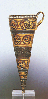 Thera, Akrotiri. Clay conical rhyton. Late Minoan I period. Demakopoulou, K. (ed.), O Mykinaikos Kosmos. Pente Aiones Proimou Ellinikou Politismou 1600-1100 BC, Hellenic Ministry of Culture - ICOM, Athens 1988, p. 156, cat. no 108. © Hellenic Ministry of Culture |