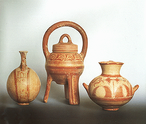 Rhodes. Flask, tripod vessel and hydria. Late Helladic III period.