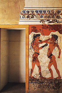 Thera, Akrotiri-Sector B. Boxing boys. Fresco from room B1. Athens, National Archaeological Museum. Hellenic Ministry of Culture/ARF.
