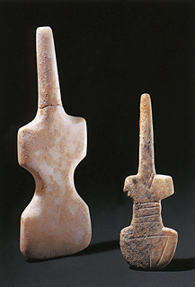 Marble fiddle-shaped figurines. Early Cycladic I. Renfrew, C., The Cycladic Spirit: Masterpieces from the Nicholas P. Goulandris Collection, H.N. Abrams, Inc., New York-N.P. Goulandris Foundation-Museum of Cycladic Art, Athens 1991 (Greek translation by K. Palyvou), p. 57, fig. 21. © Hellenic Ministry of Culture |