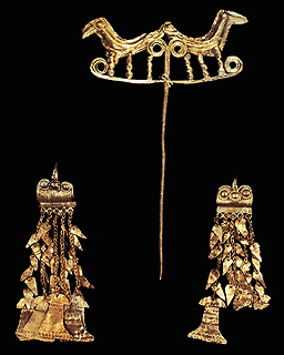 Poliochni. Gold pin and earrings from the "treasure" of the Yellow period (room 643). Scuola Archeologica Italiana di Atene (ed.), Lemnos. I poli tis Poliochnis, Hellenic Ministry of Culture-ARF, Athens 1987, cover picture and p. 6. © Hellenic Ministry of Culture |
