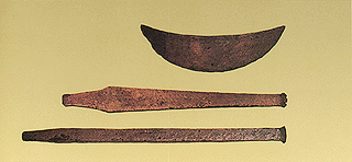 Naxos, Ailas (grave 23). Bronze crescent-shaped tool and bronze chisels. Early Cycladic II. Papathanasopoulos, G., National Archaeological Museum: Catalogue of Neolithic and Cycladic Collections (in Greek), "Melissa" edittions, Athens 1981, p. 127, fig. 54. © Hellenic Ministry of Culture |