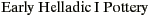 The EH I pottery is handmade and includes vases of a relatively rough clay, thin walls and bright red surface, plain or burnished. Ceramics are mainly bowls with a round or flat base and simple rim (curved or flat) bulging to the interior of the vases and outwards (T shape). The characteristic red burnished pottery includes bowls with a low or high stem and hook-shaped rim as well as shallow or deep basins. The fine vases, are not only burnished (polished), they also bear incised linear decoration. Deep cooking vessels and storage vases (pithoi) with a low or wide neck are made of coarse, dark clay. These usually bear plastic or impressed decoration. Toward the end of the Early Helladic I regional variations are observed in ceramic production. The pottery with the red coating is characteristic of the Peloponnese and it occurs on deep bowls with or without a cylindrical stem (fruitstand), which have a wide, angular rim with incised linear decoration. This pottery was recently discovered in sites of the Argolid (Makrovouni, Kephalari, Talioti) and is known as the Talioti phase.