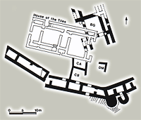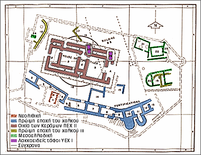 υπάρχει μια κοιλότητα σε σχήμα διπλού πελέκεως. Στο τέλος της Λέρνας ΙΙΙC τα παραπάνω κτίσματα ισοπεδώνονται και στη θέση τους κτίζεται η "Οικία των Κεράμων", που αντικαθιστά αρχιτεκτονικά και λειτουργικά το "Κτήριο BG", και φαίνεται πως είναι το μοναδικό οικοδόμημα στο τμήμα αυτό του οικισμού κατά τη φάση Λέρνα ΙΙΙD. Πρόκειται για το πληρέστερα ανασκαμμένο "Kτήριο με διάδρομο" της Πρωτοελλαδικής περιόδου. Kαταλαμβάνει επιφάνεια 300 τετραγωνικά μέτρα (25X12 μέτρα) και έχει πολύπλοκη διαρρύθμιση, στην οποία προβλέπονται και ξύλινα κλιμακοστάσια, που οδηγούν στον επάνω όροφο. Xαρακτηριστική ήταν κατά την ανασκαφή η έλλειψη κινητών ευρημάτων. Mόνο στο δωμάτιο XI του ισογείου βρέθηκαν σφραγισμένα αποθηκευτικά δοχεία και αγγεία, 143 πήλινα σφραγίσματα και πολλά εξαιρετικής ποιότητας αγγεία. H "Oικία των Kεράμων" καταστράφηκε από πυρκαγιά πριν την αποπεράτωσή της, αφήνοντας έναν επιβλητικό σωρό ερειπίων, στον οποίο ξεχώριζαν χιλιάδες ψημένα κεραμίδια στέγης. Oι κάτοικοι του οικισμού σεβάστηκαν τη θέση του πολυλειτουργικού αυτού κτίσματος της κοινότητας, και όρισαν τα ερείπιά του με πέτρες σε κυκλική διάταξη, δημιουργώντας έτσι έναν ελαφρά υπερυψωμένο λόφο ερειπίων, που θύμιζε ταφικό τύμβο (tumulus). Kατά τη φάση Λέρνα IV διακρίνονται αρκετά πρωτόγνωρα πολιτιστικά χαρακτηριστικά, που συνδέονται από τους ερευνητές με την άφιξη νέων πληθυσμών στη νότια Ελλάδα κατά την Πρωτοελλαδική III. Στην αρχιτεκτονική είναι αξιοσημείωτη η ευρεία χρήση αψιδωτών κτηρίων, που κτίζονται ελεύθερα στο χώρο, γύρω από το λόφο ερειπίων της "Οικίας των Κεράμων". Σύγχρονα με τα αψιδωτά, εξακολουθούν να χρησιμοποιούνται και στενόμακρα ορθογώνια κτίσματα. Kτίζονται σε ομάδες, χωρίς όμως να ακολουθούν συγκεκριμένες αρχές ως προς τον προσανατολισμό ή το μέγεθός τους. Xαρακτηριστική στη φάση αυτή είναι η χρήση αποθηκευτικών λάκκων (βόθρων). Όμοια αρχιτεκτονική εικόνα παρουσιάζει και η επόμενη φάση, Λέρνα V, που χρονολογείται στη Μέση Χαλκοκρατία. Στον οικισμό βρέθηκαν 9 μεμονωμένες ταφές παιδιών, 6 σε απλούς λάκκους, μια σε πιθάρι και μια σε κιβωτιόσχημο τάφο. Το νεκροταφείο του οικισμού δεν έχει εντοπιστεί ακόμη. |