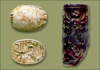 Περατή Αττικής. Σφραγιδοκύλινδρος από αιματίτη και σκαραβαίοι από φαγεντιανή.