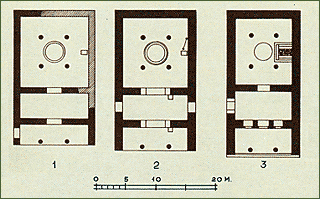 Κατόψεις μεγάρων από τις Μυκήνες (1), την Πύλο (2) και την Tίρυνθα (3).