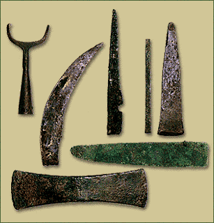 Μυκηναϊκά χάλκινα εργαλεία: πηρούνα (Μυρσινοχώρι), δρεπανόσχημο μαχαίρι,