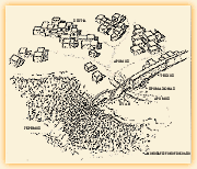 έχουν χτιστεί σε συστάδες και προστατεύονται από οχυρωματικό τείχος, ενώ