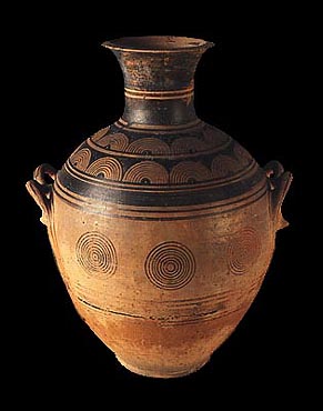 Αττικός τεφροδόχος αμφορέας Πρωτογεωμετρικής εποχής. Περίπου 950 π.Χ. Διακοσμείται στον ώμο και την κοιλιά με τα χαρακτηριστικά μοτίβα του πρωτογεωμετρικού ρυθμού: τα ομόκεντρα ημικύκλια και τους κύκλους.