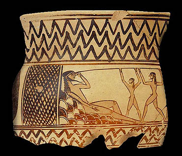 Ο Οδυσσέας και οι σύντροφοί του τυφλώνουν τον κύκλωπα Πολύφημο. Θραύσμα από κρατήρα. 7ος αιώνας π.Χ.