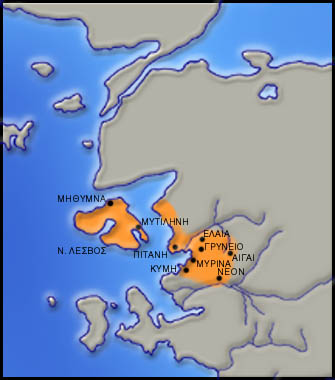Χάρτης της περιοχής των αιολικών αποικιών με το θρησκευτικό τους κέντρο Γρύνειο. Χριστόπουλος, Γ. (εκδ.), Ιστορία του Ελληνικού Έθνους, τ. Β', Εκδοτική Αθηνών, Αθήνα 1977, σ. 59. Επεξεργασία: Ίδρυμα Μείζονος Ελληνισμού.
