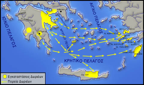 Η πορεία των Δωριέων προς τα μικρασιατικά παράλια και οι εγκαταστάσεις τους εκεί. 950-800 π.Χ. Χριστόπουλος, Γ. (εκδ.), Ιστορία του Ελληνικού Έθνους, τ. Β', Εκδοτική Αθηνών, Αθήνα 1977, σ. 27. Επεξεργασία: Ίδρυμα Μείζονος Ελληνισμού.
