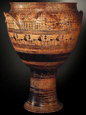 Αττικός γεωμετρικός κρατήρας, ο οποίος χρησίμευσε ως σήμα στον τάφο κάποιου αθηναίου ευγενή. Αποδίδεται στο ζωγράφο του Hirschfeld. Απεικονίζει την εκφορά νεκρού. 745-740 π.Χ.