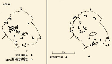 Χάρτης με τα αθηναϊκά νεκροταφεία της Υπομυκηναϊκής και Γεωμετρικής περιόδου.