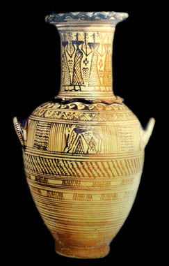 Αττική υδρία, στο λαιμό της οποίας απεικονίζονται τέσσερις γυναικείες μορφές να χορεύουν. Πρόκειται πιθανόν για θρησκευτικό χορό. Τέλη 8ου αιώνα π.Χ.