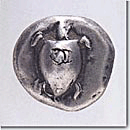 The island of Aegina was the first region of the Greek mainland that minted silver coins, the staters, in ca. 575 BC. The turtle and later the tortoise were chosen as symbols for the first mintings. The silver used for the first coins of Aegina came either from the Laurium mines, or from Sifnos. This initiative is probably associated with the fact that, since the island was the only Greek presence in the foundation of the trade community of Naucratis on the Nile Delta, the Aeginetans had got in touch with the peoples of the East and mainly with the Lydians, who invented coinage.