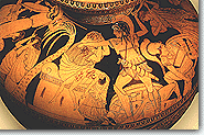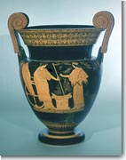 Στην ύστερη αρχαϊκή περίοδο (500-480/475 π.Χ.) η ερυθρόμορφη κεραμική υπηρετείται από ταλαντούχους αγγειογράφους που έχουν αφομοιώσει τα διδάγματα από τις έρευνες των Πρωτοπόρων. Καταργήθηκε σχεδόν ολοκληρωτικά η χρήση επίθετου χρώματος για τα ρούχα και τη δήλωση του φύλου. Ωστόσο, κάποιες λεπτομέρειες τονίζονταν με ανάγλυφο ή επιχρύσωση. Οι προοπτικές συντμήσεις για τη δήλωση της τρίτης διάστασης σε αντικείμενα γίνονται συχνότερες και αρχίζουν να αποδίδονται σώματα σε όψη τριών τετάρτων. Στα ενδύματα επικράτησε η συμβατική απεικόνιση συστάδων πτυχώσεων, αν και αποδίδονται πλέον πιο φυσικά απ' ότι στο παρελθόν. Τα καμπύλα περιγράμματα κέρδισαν έδαφος και η συνολική εντύπωση των συνθέσεων έγινε πιο φυσιοκρατική, γεγονός στο οποίο συντέλεσε και η βελτίωση στην απόδοση των οφθαλμών. Την εποχή αυτή φαίνεται πως αυξήθηκε η εξειδίκευση των αγγειογράφων, οι οποίοι πλέον διακοσμούν μία διαφορετική κατηγορία αγγείων ο καθένας. | ![]() |