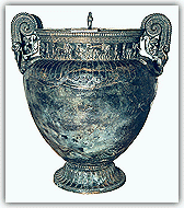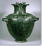 Στη διάρκεια του 6ου αιώνα π.Χ. τα εργαστήρια τορευτικής που παράγουν μεταλλικά αγγεία ταυτίζονται συχνά με εκείνα που κατασκευάζουν χάλκινα ειδώλια. Επομένως, ακολουθούν κάθε φορά τις ιδιαιτερότητες της τοπικής παράδοσης. Το αργειακό εργαστήριο πρέπει να ήταν εγκατεστημένο κοντά στο Ηραίο και τα δημιουργήματά του ξεχωρίζουν για τη φροντίδα της λεπτομέρειας και τον επιμελή σχεδιασμό τους. Κατασκεύαζε άμφωτα κύπελλα, τρίποδες, λέβητες και υδρίες. Κύριο χαρακτηριστικό του είναι τα εγχάρακτα γλωσσωτά κοσμήματα που καλύπτουν σε δύο ζώνες το αγγείο, στοιχείο που αργότερα απαντά και στην Κόρινθο. Στη Λακωνία τα σχήματα είναι περισσότερο γεωμετρικά και τα κοσμήματα στις προσφύσεις των λαβών είναι εμπνευσμένα από το ρεπερτόριο των μυθικών τεράτων. Τα λακωνικά γοργόνεια ξεχωρίζουν για την έντονα ζωώδη όψη τους. Εκτός από υδρίες είναι βέβαιο ότι κατασκευάζονταν και μεγάλοι ελικωτοί κρατήρες με σφυρήλατο σώμα και χυτές λαβές. | ![]() |